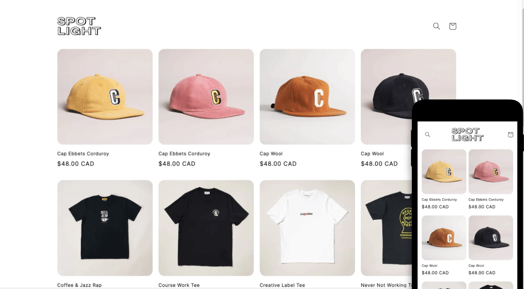 He Spotlight theme is a free, mobile-optimized option ideal for stores with less than 200 products, offering quick setup and essential features like image galleries, cross-selling, and a slide-out cart. Its clean design and user-friendly interface make it easy to launch a store without additional apps. However, it has limited advanced customization and lacks some premium features, which may restrict businesses seeking a highly unique storefront. Mixed reviews highlight functionality issues, but Spotlight remains a solid choice for those starting out with basic needs.